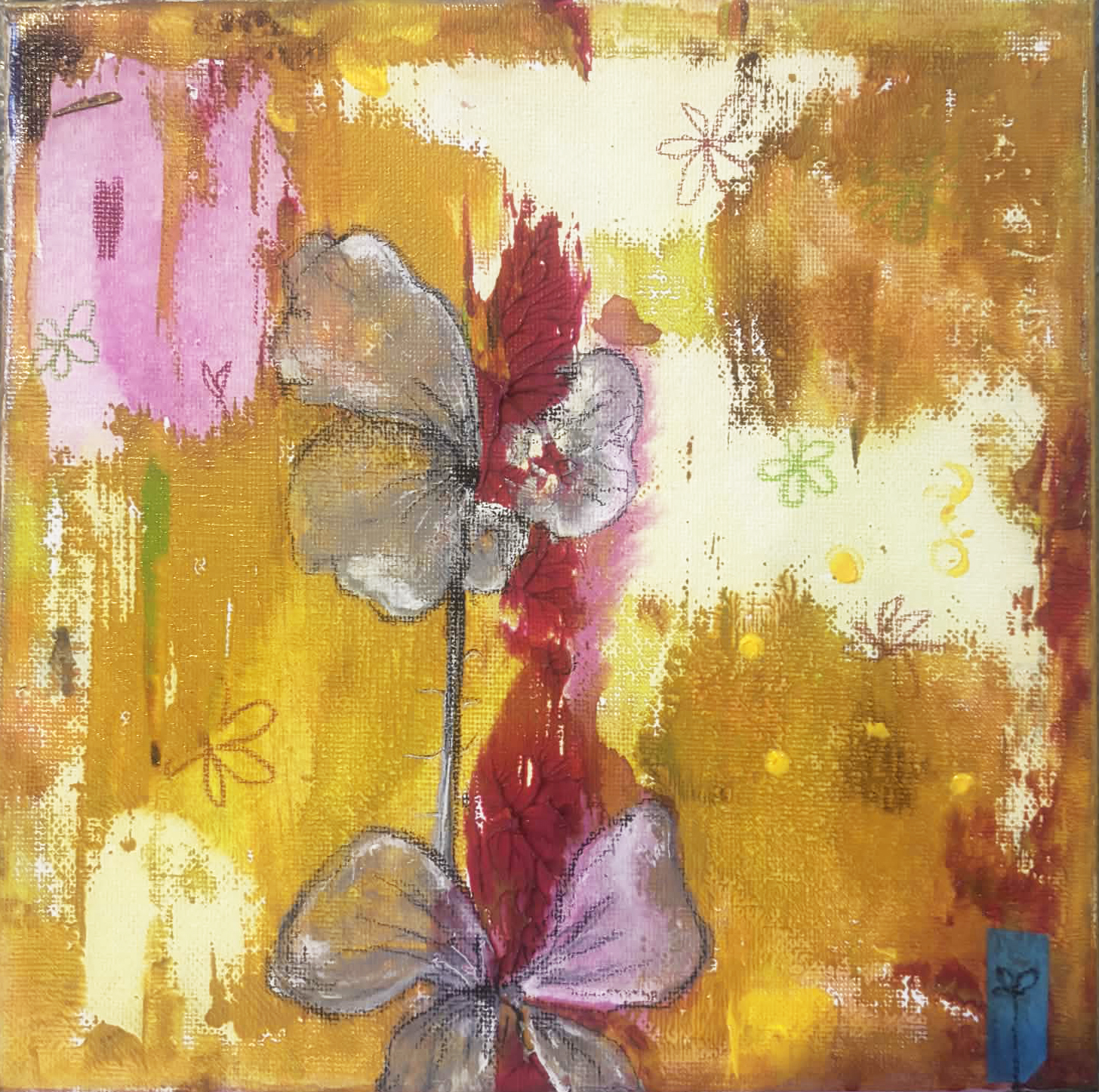 The artworks are made using mixed media: paints and recycled materials on canvas.